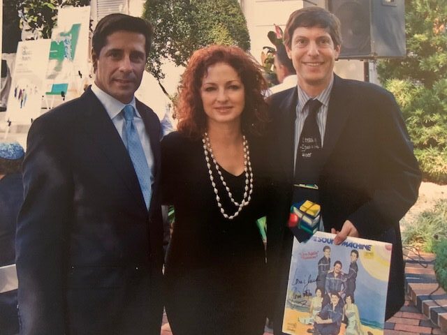 Gloria Estefan at a Council of Educational Change event. Pictured is an unwrapped vinyl Miami Sound Machine album that when it was released, the name Gloria M. Fajardo appeared in the credits.